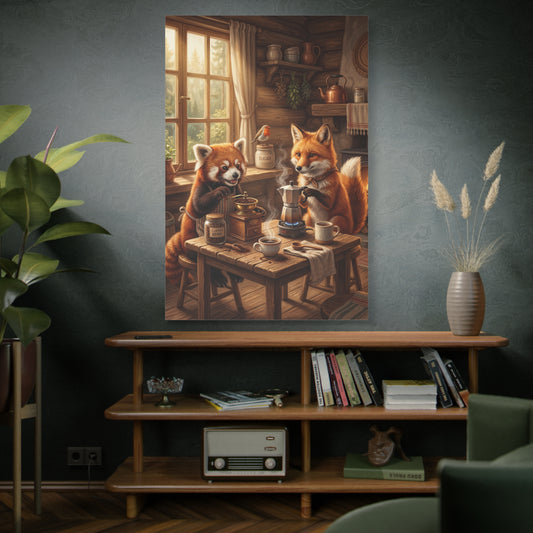 Cozy Woodland Coffee Time – Red Panda & Fox Rustic Cabin Canvas Wall Art