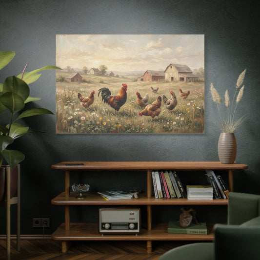 Rustic Farmyard Charm – Rooster and Hens Countryside Canvas Wall Art