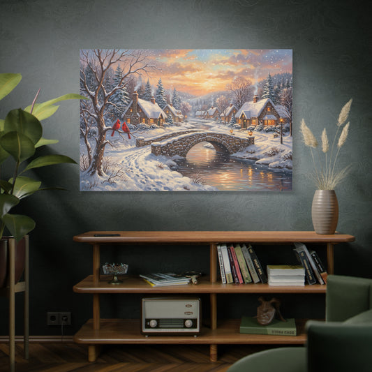 Winter Village Serenity – Snowy Cottage Bridge with Cardinals Canvas Wall Art