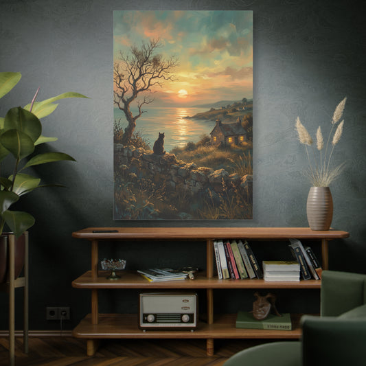 Sunset Solitude – Cat Overlooking a Coastal Haven