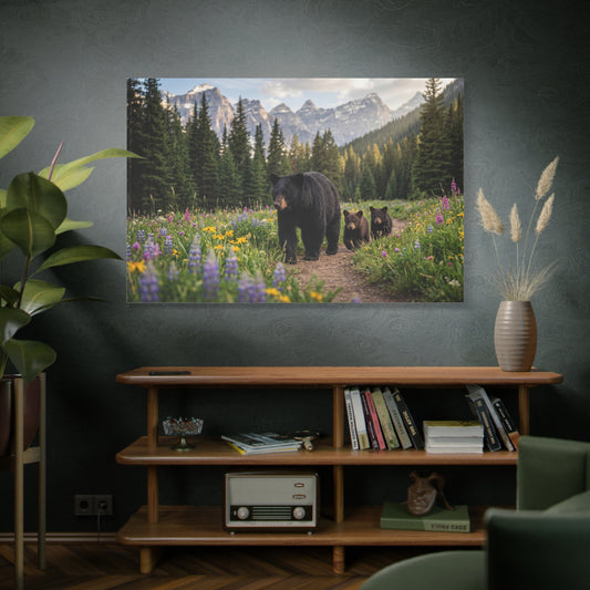 Wild Harmony – Mother Bear and Cubs in Mountain Meadow
