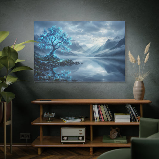 Ethereal Glow – Mystical Blue Tree by the Lake Canvas Wall Art