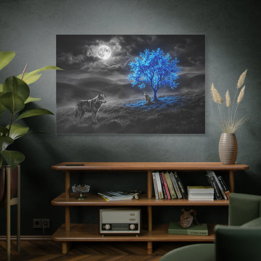 Moonlit Guardians – Wolves and Glowing Blue Tree Canvas Wall Art