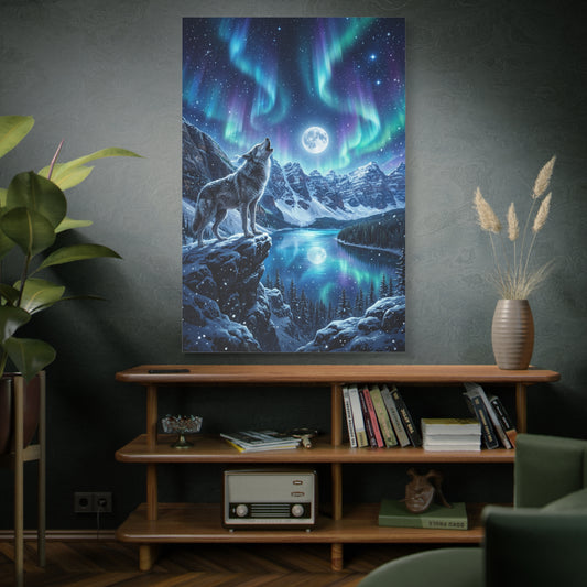 Majestic Wolf Under Northern Lights – Snowy Mountain Night Canvas Wall Art