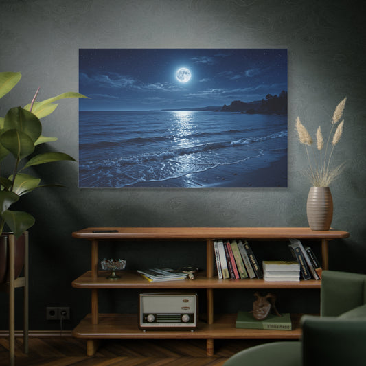 Midnight Ocean Glow – Full Moon Beach Canvas Wall Art