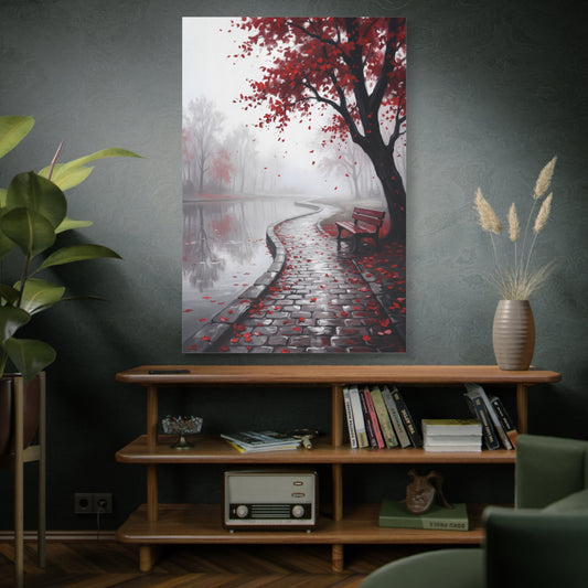 Crimson Serenity – Red Leaves Lakeside Path Canvas Wall Art