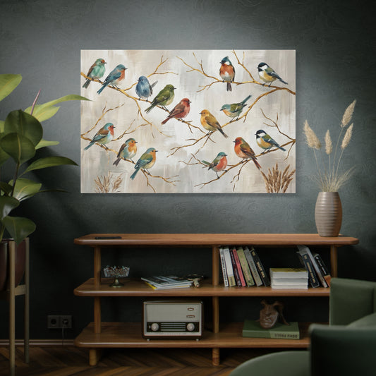 Colorful Songbirds on Golden Branches – Elegant Bird Canvas Wall Art