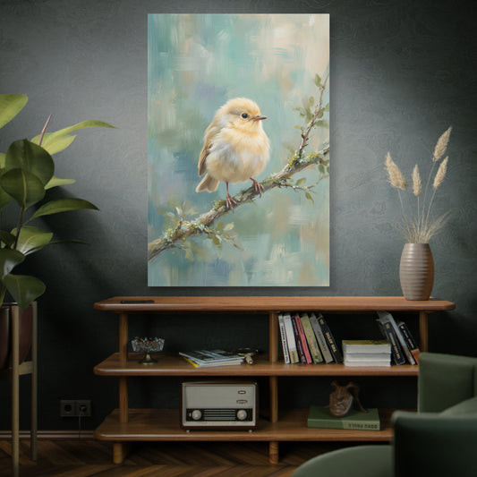 Soft Serenity – Fluffy Baby Bird on Branch Canvas Wall Art