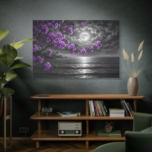 Moonlit Serenity – Purple Blossom Ocean Night Canvas Wall Art