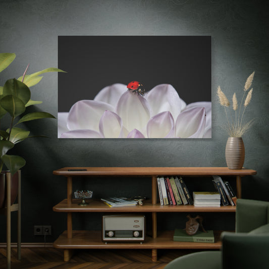 White Dahlia & Ladybug Harmony – A Nature-Inspired Art Print