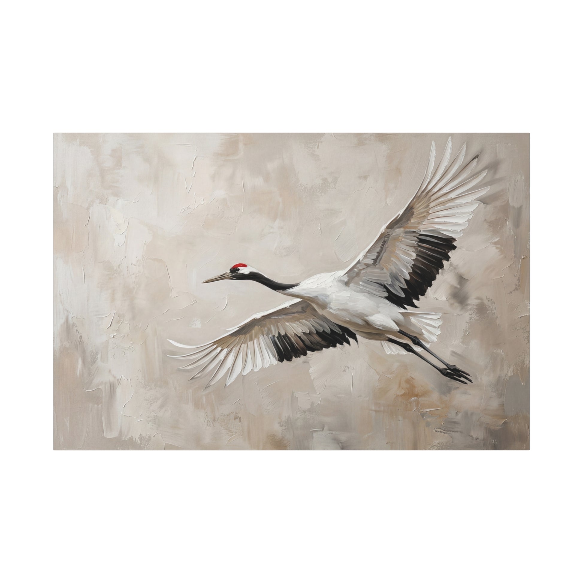 Capture the essence of elegance and freedom with this stunning artwork of a graceful crane soaring through a soft, textured neutral backdrop. With wings fully extended and delicate feather details, the crane symbolizes peace, longevity, and balance—making this piece both visually striking and deeply meaningful.